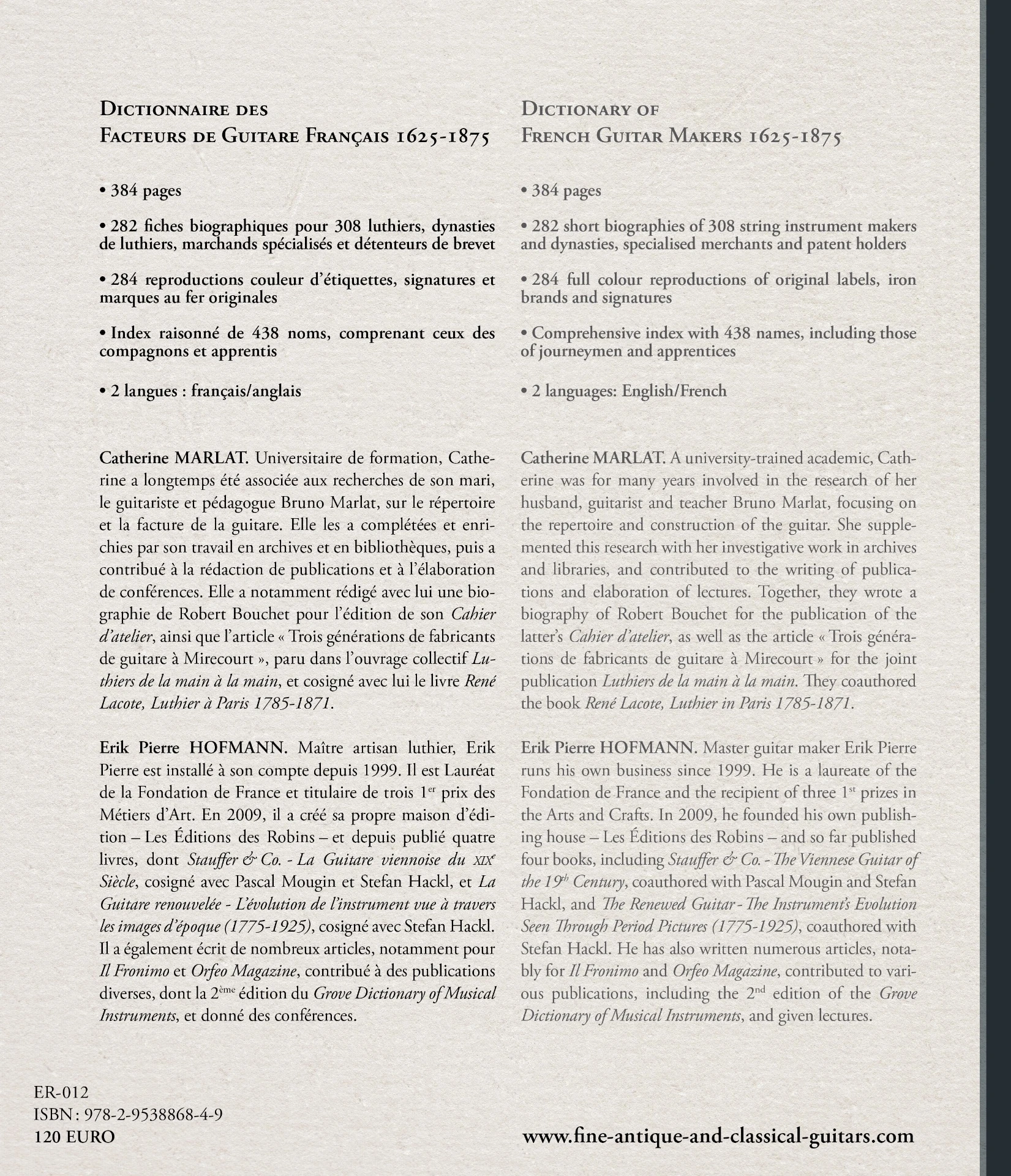 Of course, this role as the epicentre of all guitaristic activity – one that the neologism guitaromanie ultima-tely fails to capture – was often shared: sometimes with an entire nation (the Spanish one), at other times with European metropolises (Naples, Vienna and London). But nowhere else was this much music for the guitar written, published and played, nowhere else were this many pedagogical works for it published, and nowhere else – possibly with the exception of Spain – were this many craftsmen and inventors devoted to it. Often at a loss, occasionally with profit, but always with passion. That is one of the lessons to be drawn from the approximately 300 individual stories of instrument makers, inventors, and specialised merchants gathered in this book.